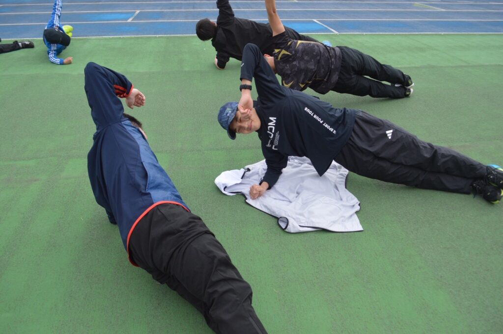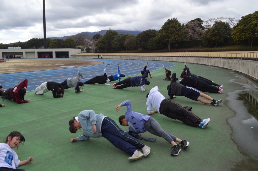 その後は、全員で動的ストレッチを行い、身体の可動域を広げながら動きづくりへ。
