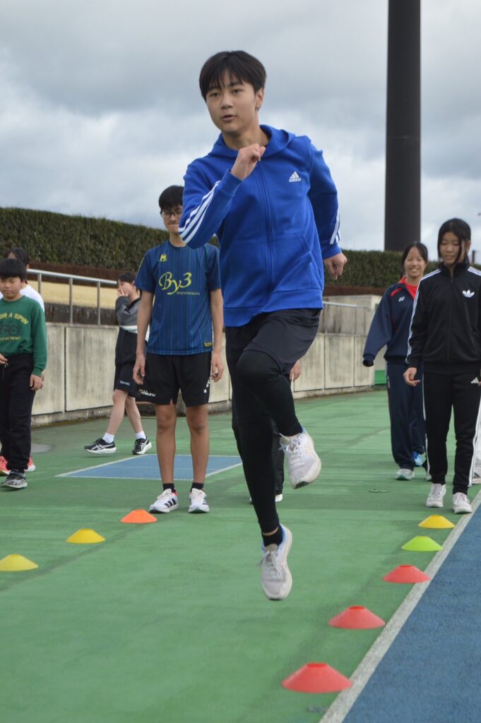 それぞれの距離に合わせた設定の中で、足を身体の真下に接地することを意識しながら走り、走りのリズムやフォームを確認していきました。