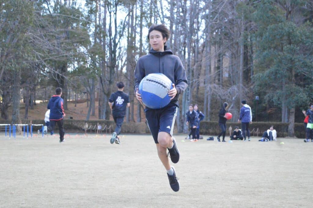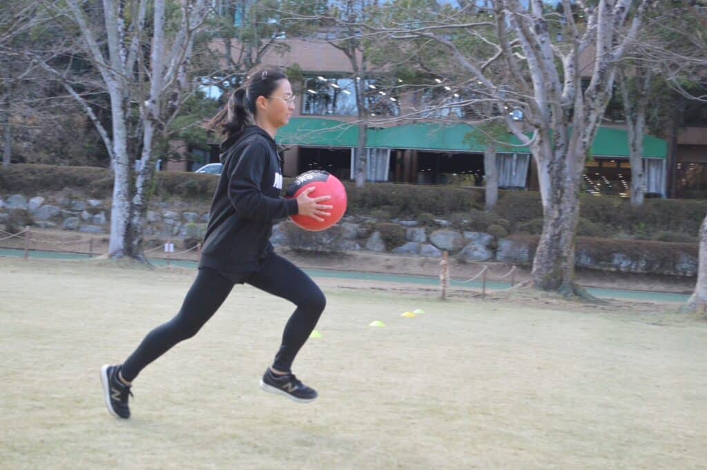 重いボールを持って走ることで、身体がぶれるとすぐに分かります。