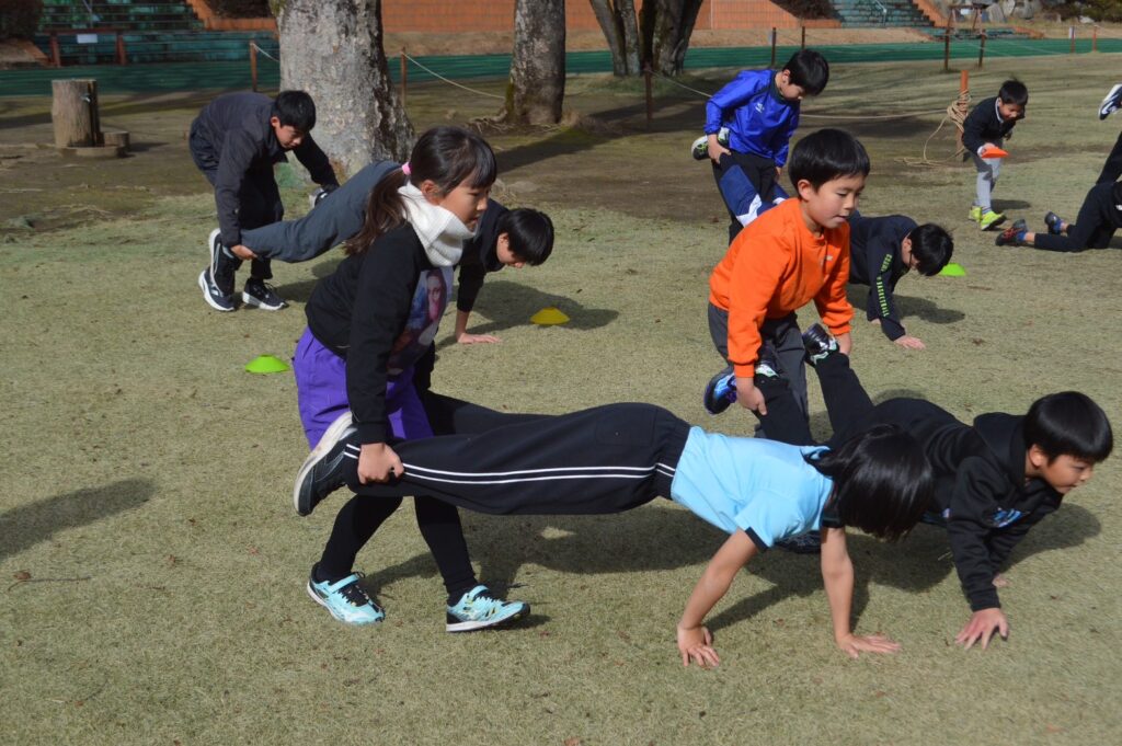 身体が温まってきたところで、かけっこ・クラブに分かれて動きづくりに入りました。